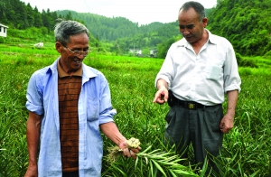 7月4日,永顺县两岔乡团结村70岁老人王连凤和首车镇中坝村73岁的农民高级农艺师唐昌太,在自己种植的百合地里观看丰收在望的百合。