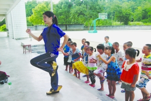 7月12日,阳光灿烂。广东湛江师范学院40名大学生,来到永顺县仓坪小学开展为期15天的暑假“三下乡”支教活动。在操场上,孩子们跟老师学武术、玩游戏。在教室里,上书法课、礼仪课、舞蹈课、音乐课……100多个孩子分别在大学生们的组织下,活动开展得有声有色。图为孩子们在学健身操。