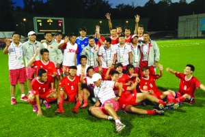 7月13日,中国队队员和教练在比赛结束后以比分牌为背景合影留念。当日,在俄罗斯喀山举行的第27届世界大学生夏季运动会男子足球排位赛中,以北理工为班底的中国队在0比1落后的情况下连入四球,以4比1击败巴西队,成功晋级9至12名排位赛,同时取得了下一届大运会足球比赛的资格。 新华社记者 姬 烨 摄