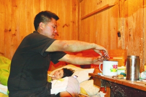 为了给妻子补充营养,杨通发尽量每天换菜谱,定时帮妻子按摩、翻身,不停地为她擦口水,每天清洗所有床单、衣被,至今,妻子全身上下没有一个褥疮。杨通发对笔者说,现在护理妻子轻松一点了。刚从医院回家时,时刻不能离身,而孙子又小,有时还得两个同时把屎尿,那时,真恨不得自己有分身术。