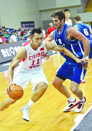 7月19日,中国队队员易建联(左)在比赛中进攻。 当日,2013中欧男篮锦标赛中国队对阵冰岛队的比赛在江苏省昆山市举行。本场比赛易建联拿下13分,陈江华10分,李晓旭6分,周鹏7分,此前被曝无缘12人名单的王治郅出场拿下4分。