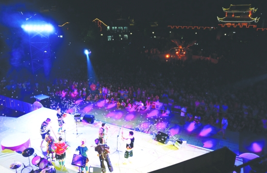 灯光璀璨的凤凰古城文化广场充斥着热爱音乐的人潮。 周玮玮 张顺心 田明欣 摄