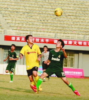 7月20日,凤凰县2013年“同济杯”青年足球赛在该县体育馆开幕。此次赛事共有新人类足球俱乐部、好小子足球俱乐部等10支球队参加,从7月20日开始到8月10日结束。图为参赛队员在比赛中争顶。