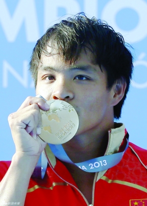 7月26日,何冲在比赛夺冠后亲吻金牌。当日,2013年世界游泳锦标赛跳水比赛在巴塞罗那展开第七日角逐。在男子三米跳板决赛中,中国选手何冲表现出色,凭借总分544.95分问鼎桂冠,帮助中国跳水队获得世锦赛此项目四连冠。同时,何冲成为历史上第二位获得世锦赛此项目三连冠的选手。另一位中国选手秦凯以总分473.25分名列第五位。