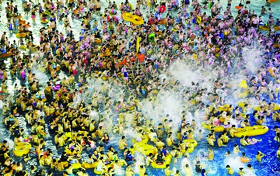 7月29日,湖北省武汉市,近日江城暑热难解,人们纷纷前往水上乐园解暑,由于人数众多,形成了“下饺子”的壮观场面。 图/CFP