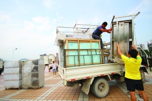 “小心搬运,不要弄坏新橱柜”。8月2日,花垣县11所农村学校,在边城高级中学操场上忙着领食堂新设备。据了解,今年“春苗营养厨房” 项目,给该县11所农村学校,每校配备5万元的食堂厨房设备。秋季开学后,学校就可以用上新设备。