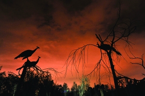 8月9日晚,三只孔雀在云南野生动物园的“夜间动物园”内休憩。