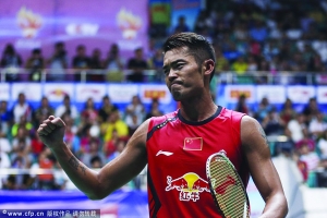 8月10日,林丹在庆祝比赛胜利。当日,2013年世界羽毛球锦标赛在广州进入到第六比赛日,男子单打结束首场半决赛,林丹在场上逐渐发力掌控局势,他用时49分钟以21比17、21比15直落两局击败越南的阮天明率先闯入决赛。这也是林丹第六次杀进世界羽毛球锦标赛决赛。