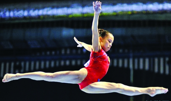 2012年第五届亚洲体操锦标赛,16岁的中国女队队员商春松表现抢眼,在众多强手中获得女团、平衡木、自由体操3枚金牌。教练熊景斌说:“这个孩子具有一定的天赋,值得培养。”(资料图片)
