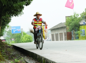 9月6日,319国道养护工人杨昌瑞老人,骑着单车来扫马路。 杨昌瑞家住花垣县城里,今年59岁。近年来,花垣县加强公路的养护管理工作。去年,杨昌瑞主动参加了国道的养护工作。他负责该县团结镇到老鸦塘村的路段。为了把道路清扫干净,他每天早上6点钟骑着单车从县城出发,行走10多公里,来到他负责的路段。然后,就开始了他一天的马路养护工作。他说:“不管刮风下雨,我都骑着单车来上班,一年多来,从不迟到。”他还说:“骑单车是环保,可以省钱,还可以锻炼身体,一举多得。”老人笑着说。一年多来,他已骑行护路近两万公里。由于他的认真负责,该路段养护工作受到好评。 龙恩泽 摄 |