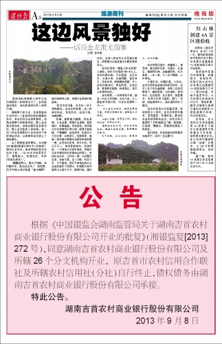 根据《中国银监会湖南监管局关于湖南吉首农村商业银行股份有限公司开业的批复》(湘银监复[2013]272号),同意湖南吉首农村商业银行股份有限公司及所辖26个分支机构开业,原吉首市农村信用合作联社及所辖农村信用社(分社)自行终止,债权债务由湖南吉首农村商业银行股份有限公司承接。