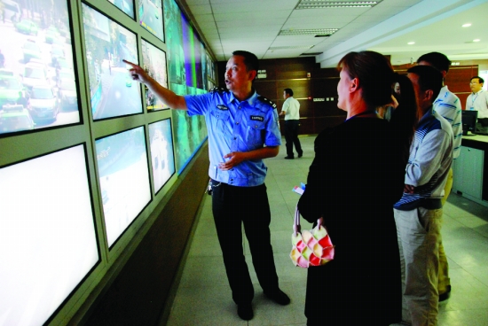 民警在交警监控中心的大屏幕前,面对面地为的哥的姐们解释说明各种交通问题,回答他们对日常处罚存在的疑问,提醒注意常出现的违章行为。 记者 陈 昊 摄