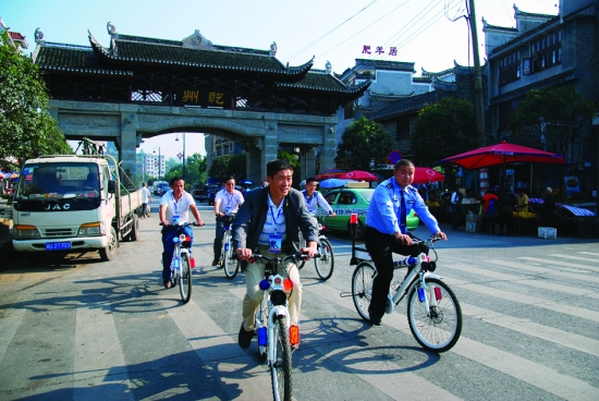 “巡逻喽!”营员们与乾州派出所民警一道,骑着警用自行车上路巡逻。 记者 陈昊 摄