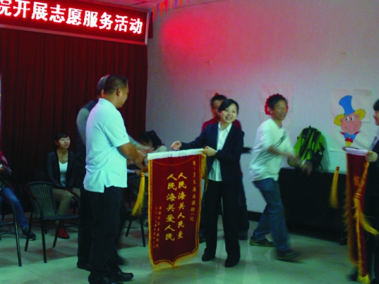 图为深圳皇岗海关旅检一处处长李思明等人从州社会福利院负责人手中接过锦旗。