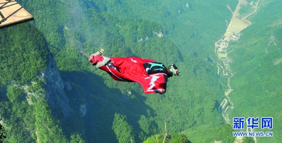 10月12日,新西兰选手丹·维卡里在比赛中。当日,第二届翼装飞行世锦赛在湖南张家界天门山景区正式开赛,14名全球顶尖翼装飞行运动员参与角逐。 新华社记者 龙弘涛 摄