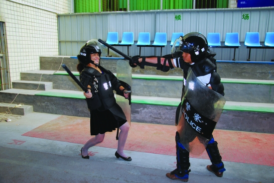 的哥的姐穿上全套的防暴装备,秀起了“功夫”。 陈 昊 摄