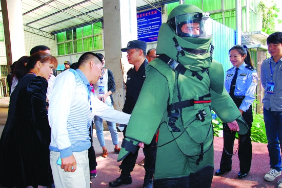 营员们饶有兴致地了解特警队的排爆装备。这套装备原产英国,由19个组件组成。能够阻燃、防水、防破片、防冲击波及声波、热辐射。全套装备总重约15公斤,穿戴时需要俩人在旁帮助,行动十分不便,但却能为排爆专家提供全方位保护。 陈 昊 摄