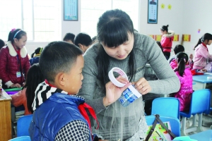 11月12日,长沙市芙蓉区教育后备干部来到泸溪县合水镇小学为这里的留守儿童发放学习用品并开展互动活动。图为一名女后备干部与留守儿童一道做手工。 李焱华 张建兵 摄