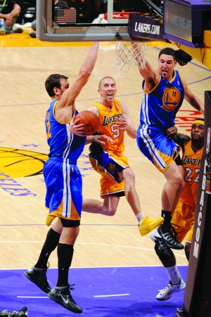 11月23日,湖人队队员布雷克持球突进撕破对手防线。当日,NBA常规赛湖人主场迎战勇士。最终,湖人以102比95击垮勇士。湖人队加索尔24分10篮板,布雷克14分5助攻,尼克21分,法玛尔14分8助攻;勇士队库里本场缺阵,伊戈达拉伤退,大卫21分13篮板,哈里森20分,汤普森19分,博古特12分13篮板。