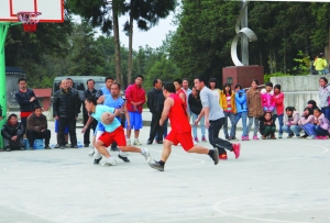 11月27日,花垣县吉卫民中校园内,该校篮球队正与排碧学校篮球队切磋球技。近年来,吉卫民中经常邀请兄弟学校开展篮球、乒乓球等体育运动和课堂教学等方面的经验交流,既增进了各校的友谊,又为教师们搭建了互相学习、交流展示的平台。