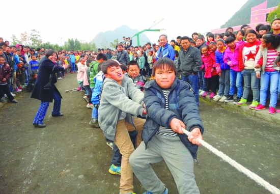 12月6日,花垣县道二乡九年制学校师生在进行拔河比赛。入冬以来,该县各中小学纷纷开展拔河、篮球、乒乓球、登山等丰富多彩的课外活动,促进学生阳光运动。 吴红艳 石岩花 摄