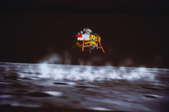 12月14日,嫦娥三号平稳落月,中国首次地外天体软着陆成功。这是北京飞行控制中心大屏幕上显示的嫦娥三号探测器。 新华社记者 金良快 摄