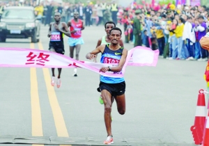 12月21日,埃塞俄比亚选手泰菲力·贝查·瑞卡萨率先冲过终点。他以2小时12分07秒的成绩获得男子全程马拉松赛冠军。当日,2013年“恒大杯”海南(儋州)国际马拉松赛举行,埃塞俄比亚选手包揽男女冠军。 新华社记者 赵颖全 摄
