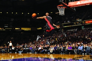 12月28日,热火队队员詹姆斯在比赛中飞身扣篮。当日,NBA常规赛继续进行,国王主场迎战热火。最终,热火客场103比108加时不敌国王,詹姆斯全场得到33分8板8助攻,波什18分7板,查尔默斯11分10助攻,科尔13分。国王队的考神27分17板,盖伊26分5失误,托马斯22分11助攻。