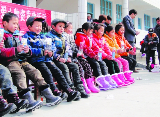 12月27日,花垣县吉卫镇过水小学的孩子们开心地穿上了崭新的雪地靴。当天,“神秘湘西多背一公斤”爱心团队为该镇过水小学72名留守儿童每人带来棉袜、雪地靴、羽毛球拍,还为过水村、良帽村5位空巢老人送来长寿面、电热毯、棉被等食品和日常用品。 吴红艳 龙海燕 摄