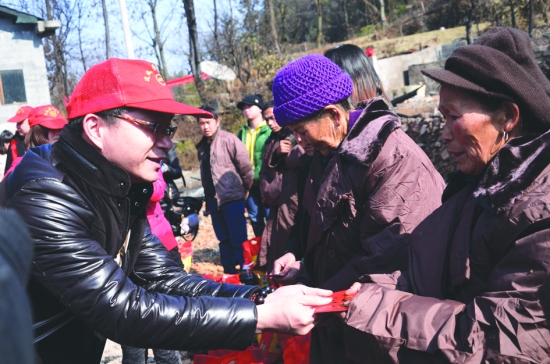 志愿者给灾民送上慰问金。李 杰 摄