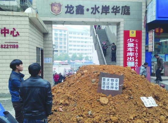 两车黄土堵住小区的大门,业主与物业的矛盾在这里集中暴发。 欧阳仕君 摄