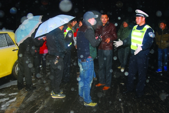 谢开祥耐心细致地向司机们说明情况,希望他们赶紧把事故车辆挪到路边,给后续车辆让出通道。地面已结上一层冰。