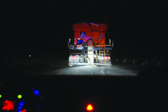 凌晨4时,回程的路上,已经没有了过往的车辆,我们的车跟随在路政撒盐车后小心翼翼地前行着。大家都沉默着,也许是累了,也许是在回味高速路上这一夜发生的一切。撒盐车撒出的盐,如雪花般美丽。借着车灯,把这繁忙过后难得的宁静,定格。