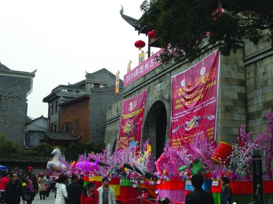 乾州拱极门外集中展示乾州“春”,吸引市民和游客观看。 杨继东 摄