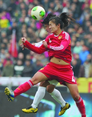 2月15日,中国队队员李佳悦(前)与朝鲜队球员争顶头球。 当日,2014永川国际女足邀请赛展开最后一轮争夺,中国队以1比0战胜朝鲜队,以三战全胜的战绩夺得本次比赛的冠军。