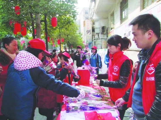 2月14日,边城爱心协会保靖分会的爱心志愿者们正在保靖大街小巷举行公益助学大型义卖活动。该协会本着“帮助需要帮助的人”的助学宗旨,通过义卖一支玫瑰传递爱的温暖,让更多的人关注和帮助贫困山区孩子。当天共卖出400余支玫瑰花,筹措爱心助学金8000多元。 田亚君 龙术娥 摄