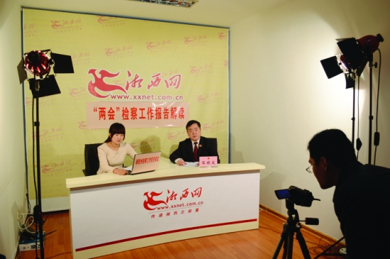 在湘西网会客厅,石续发就“两会”检察工作报告进行视频解读。 李 杰 摄