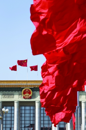 这是3月1日拍摄的北京人民大会堂外迎风招展的红旗。