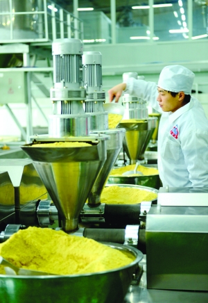 3月1日,在湖北省宣恩县一食品加工企业的生产车间,工人将黄豆加入机械生产“合渣粉”。