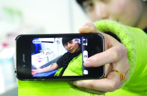 3月6日,龙山县第五小学女教师谢辉在无偿献血的时候,用手机给自己留影。这天,该校的21名教师参加了 无偿献血献爱心活动,献出了6300毫升的热血。