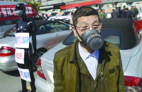一位参加“问题车展”的车主带着防毒面具站在他的汽车边。车主称该车已购买5年多,车内仍有严重异味。