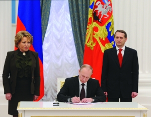 3月21日,俄罗斯总统普京在莫斯科克里姆林宫签署克里米亚入俄条约。
