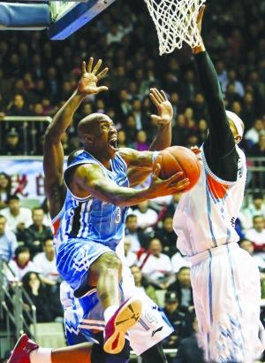 3月21日,北京金隅队球员马布里(左)在比赛中突破上篮。经过加时赛的艰苦鏖战,21日晚北京金隅队在客场再下一城,以90比86击败新疆广汇队,总比分2比0领先。接下来,北京队将回到万事达中心迎来连续三个主场。总决赛7场4胜制,采用2-3-2。两队的第三场比赛于23日开战。