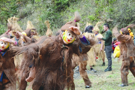 3月18日,古丈县断龙山乡土家族社巴节活动中,土家族“厄巴舞”憨态可掬。当天,四周村寨的土家人汇聚到该乡田家洞村社场坪,共同欢度社巴节。据了解,每年的这个时候这个地点,当地土家人都会自发地举办社巴节,祭祀先祖,祈求来年丰收,从来没有中断过。 向汉品 摄