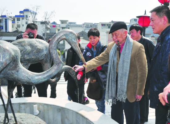 黄老对喜鹭桥雕塑的每一个细节都边摸边问。