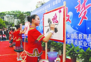4月19日, 州职业教育成果巡回展保靖现场,保靖县职业中专学校以“共筑职教梦”为主题,通过技能展演和成果展示,将职业教育理念传递到社会各界人士心中。近年来,该校以“市场为导向,立足县域经济,走进企业”为原则,坚持“校校联合”、“校企合作”办学模式,开设了服装设计等十大类专业,先后与湖南有色金属职业技术学院、海尔集团等校企建立“联姻”关系。本次展演的服装设计、园林绘画等几个热门专业,赢得在场合作办学院校、合作办学企业及社会的好评。图为学生现场绘画及剪纸展示。