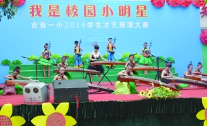 4月30日,吉首一小举行了“我是校园小明星”学生才艺展演大赛。各班小选手们经过精心准备,拿出了各自的绝活,唱歌、舞蹈、器乐、小品等等,在舞台上尽情演绎,用活力、用激情展现了新时代小学生良好的精神风貌,展示了吉首一小孩子们的才艺和风范。图为教师与学生表演器乐合奏。