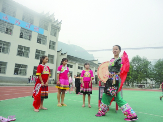 秧先翠向孩子们传授苗鼓技艺。
