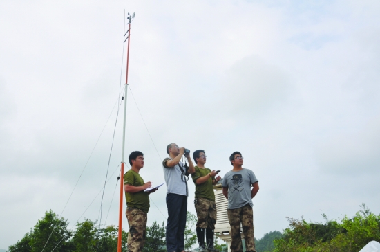 7月1日,湘西土家族苗族自治州花垣县海拔707米的多角大义山顶气象站,业务管理人员和气象观测员正在对机场预选场址周围的能见度目标物进行最后的标定。 张 宇 摄