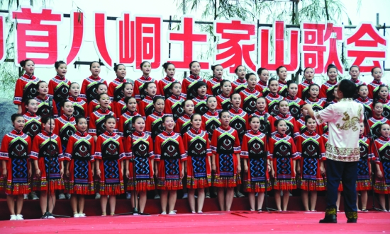 在7月1日举行的山歌会开幕式上,保靖民中师生表演《巴呔巴呔卡普它》。 向汉品 摄